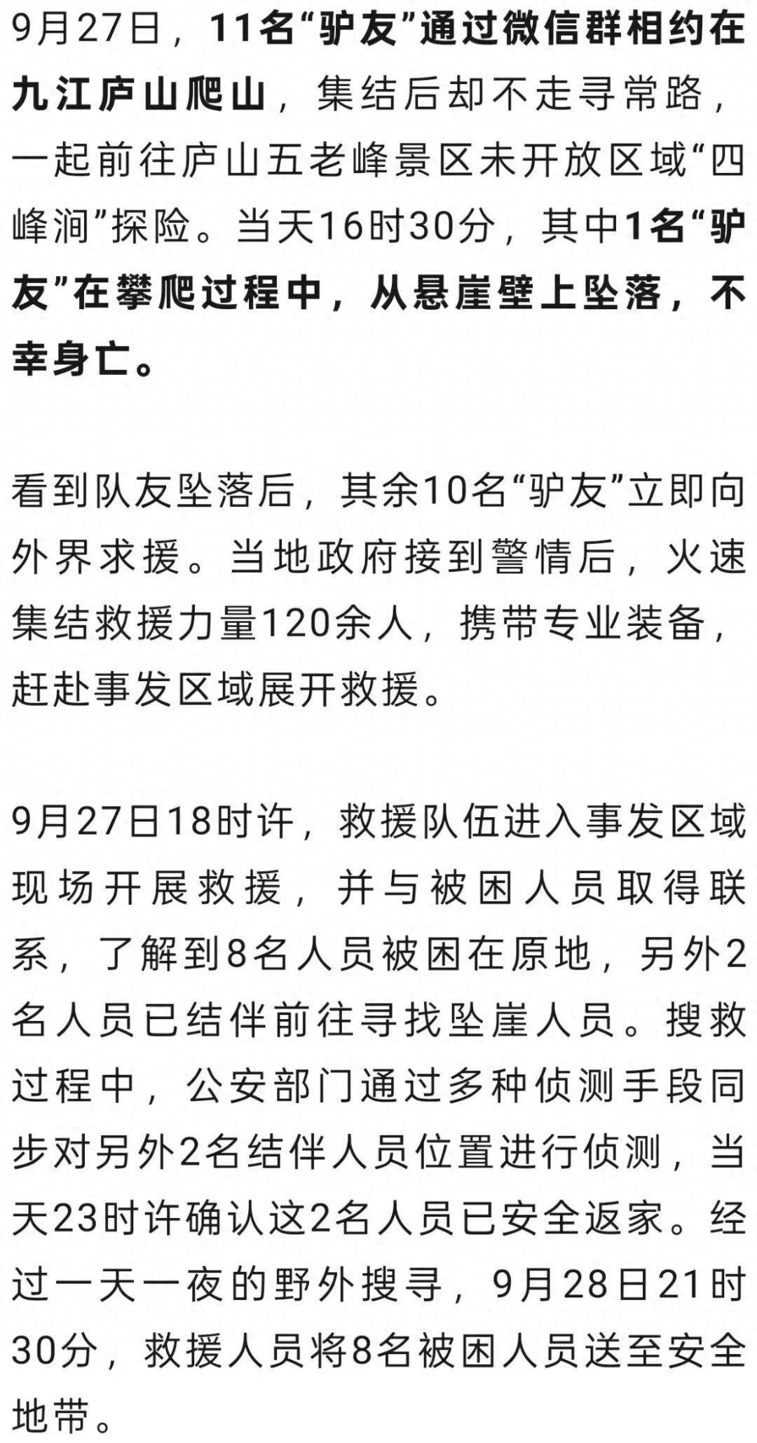11月17日,记者从江西省应急管理厅官网发布的新法治报报道了解到,庐山“9·27”驴友野游救援事件处理有了最新进展成都股票配资平台,当地政府依法依规对被困“驴友”追偿7.4万元救援费用。该野游活动组织者已被行政拘留10日。