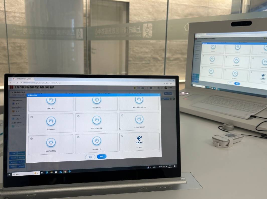 在D区的透明办公间里,一台主机搭配了四块电子屏,颇为引人注目。主机屏幕上显示着上海市黄浦区智能帮办业务应用系统,四块电子屏可以同步转接主机实时画面,为企业上门群体一键展示应用服务。一个个蓝色的图标代表着不同的服务部门,电信作为其中紧密嵌入的一环,通过线上线下相结合的方式,为企业提供高效服务。