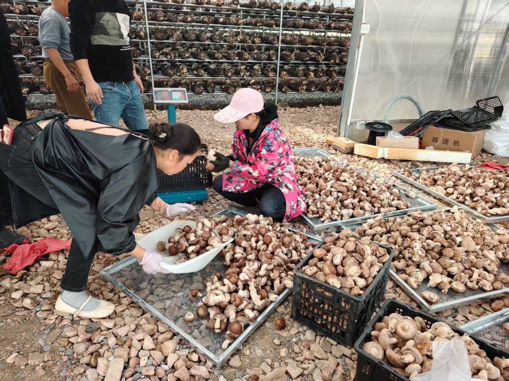 在8亩香菇种植大棚内,一排排菌棒整齐排列,一个个饱满的香菇簇拥而出,白胖的菌盖边缘泛着鲜嫩的光泽,村民们穿梭其间,指尖轻捻便将成熟的香菇采摘入筐;不远处的2亩深加工厂房内,工人们正忙着对新鲜香菇进行分拣、烘干。