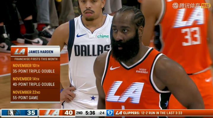 49-56,半场结束独行侠暂时落后快船7分。