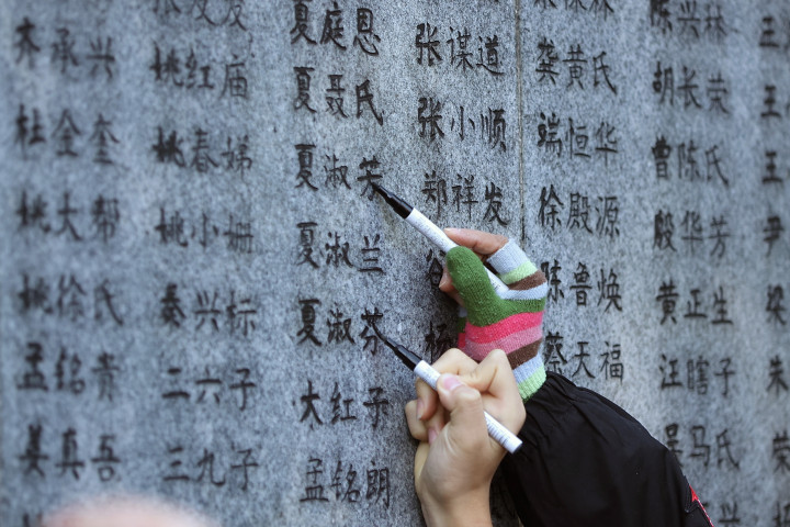 站在南京大屠杀遇难者名单墙(“哭墙”)前,