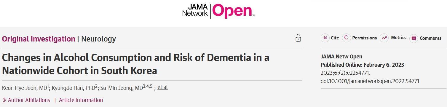 同样发表在《JAMA Network Open》期刊上来自韩国首尔国立大学、龟尾大学的研究团队的研究,发现了酒精摄入变化与痴呆风险的关系。
